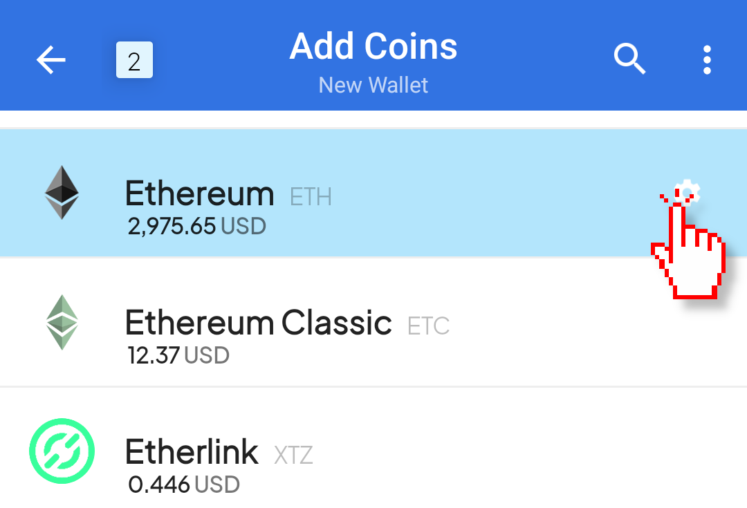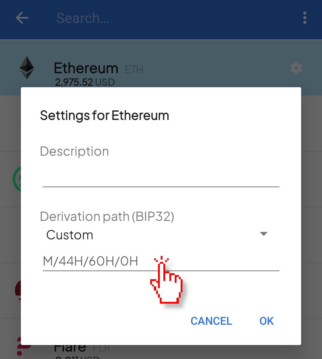 If you have an Ethereum-style coin (Ethereum, Base, BNB, etc) in any of those wallets, tap the "⚙️" icon on the right side of the screen when adding those coins. On the popup window under "derivation path" select "custom" (see image below) and enter the following derivation path: M/44H/60H/0H/0 for ETH and M/44H/61H/0H/0 for ETC. If the created wallet doesn't contain all your Jaxx funds, funds in secondary addresses cannot be imported (only the first address of its derivation path can be monitored)